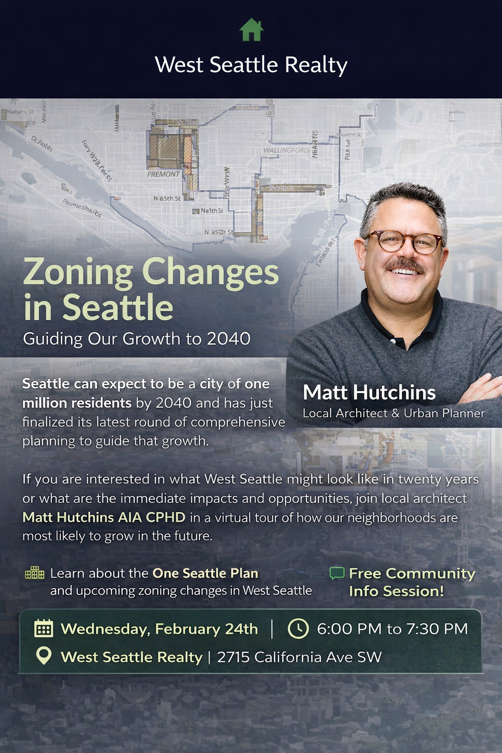 Zoning Changes and the impacts to West Seattle Tuesday, February 24, 2026 6:00 PM 7:30 PM West Seattle Realty 2715 California Avenue Southwest Seattle, WA 98116 United States (map) Google Calendar ICS
